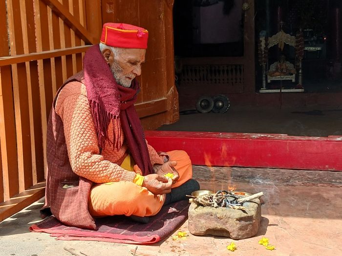 - 24 – India 2026 – Le pujari du temple de Krishna est à la fois le curateur du temple et le prêtre effectuant, cérémonie dévotionnelle envers la divinité du temple. Il exécute avec précision des gestes rapides et sûrs suivant le rythme des incantations traditionnelles. Lors de cette puja tous les éléments sont présents : la terre, l'eau, le feu, l'air et l'espace. Il s'affaire toujours , dans des gestes machinaux et des paroles à peines balbutiées en un sanskrit incompréhensible. |